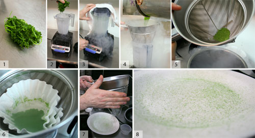粉狀的新鮮藥草。這項技術可以使您的粉末與任何干草藥一樣細,但又新鮮。它看起來很棒,氣味很香,味道也很香。這是均勻涂抹草藥混合物的**方法。1)用開水將草藥燙一下,否則它們會變黑。擠出多余的水。2)用液氮至少將Vita-Prep投手裝滿。帶有濕刀片的大水罐不能很好地解決這個問題,因為產品會四處噴灑。帶有干燥刀片的較小的水罐永遠不會造成問題。將草藥放入水罐中,使其冷凍。3)蓋上并融合,緩慢地朝著高速前進。添加液氮后,請勿等待太久才能打開攪拌機,否則軸承會發出可怕的聲音。4)將混合物倒入湯鍋中。5)殘留在中國的東西對我們來說太粗糙了。將其放回投手進行下一輪比賽。6)通過咖啡過濾器將混合物倒入鍋中。這是好東西。7)將粉末放入中國風,然后將其輕拍到您的盤子上-在粉末仍冷凍的情況下進行。您也可以將這些東西折成鮮奶油,土豆泥等。記住,隨著香草的融化,香氣和味道會急劇增加。不要過分。8)解凍。