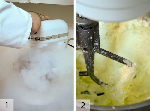 液氮冰淇淋通常在帶有槳葉附件的廚具中制作。不要使用打蛋器。混合器實際上所做的只是將液氮攪拌到混合物中,而不提供充氣。液氮劇烈沸騰,因此會同時提供充氣和凍結。但是液氮也會浮動-因此如果沒有攪拌機,您將使用一噸液氮并凍結表面。在冰箱溫度下,每升冰淇淋基料需要大約一升液氮來制作冰淇淋。以中等速度打開攪拌機并緩慢添加液氮以防止飛濺。液氮霧將無處不在,您什么也看不到。等待霧消散。用堅硬的金屬刮刀刮擦碗的側面。如果混合太軟,則添加更多的液氮。如果混合太硬或硬塊與柔軟的部分混合在一起,請將混合器調高一點,使質地均勻。液氮容器